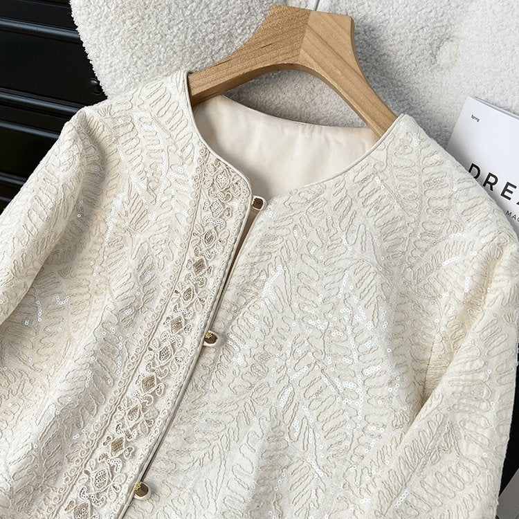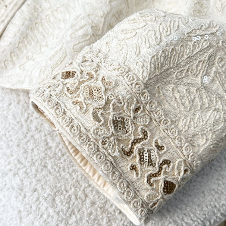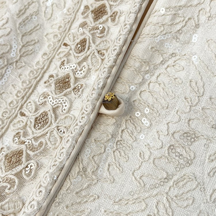 This off-white jacket is a perfect blend of elegance and fashion. The exquisite pattern and delicate lace splicing design show extraordinary temperament, and the low-key and shining metal buttons add a noble texture. The unique hollow design of the cuffs highlights your unique taste, and it can make you the focus of attention whether it is daily combination or special occasions. Wear it and immediately enhance your overall image, make every appearance full of confidence and charm, and achieve your fashion legend!