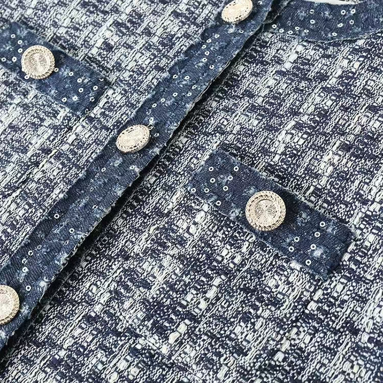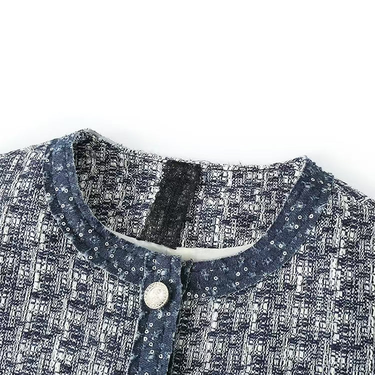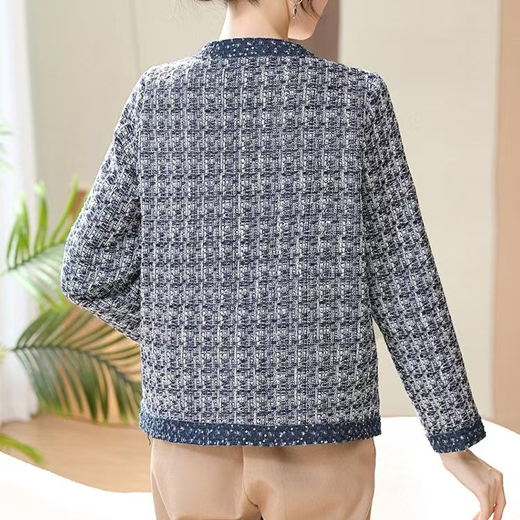 This exquisite coat features a distinctive blue and white tweed texture, adorned with elegant buttons that enhance its sophisticated appeal. Perfectly paired with a simple beige knit inner layer and khaki trousers, every element of this ensemble exudes confidence and taste. Effortlessly capturing the alluring charm of the mature woman, this coat transforms your appearance with its refined elegance and timeless style!
