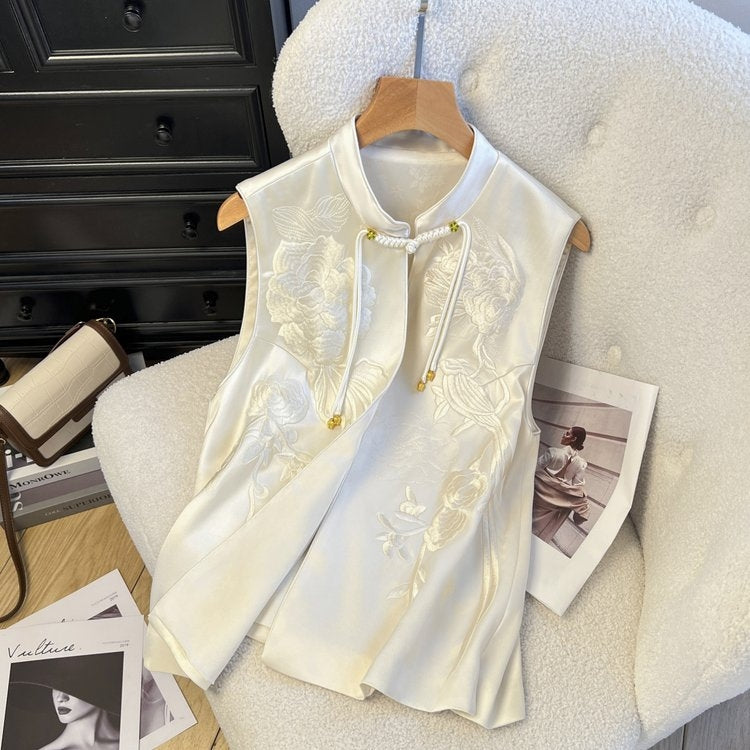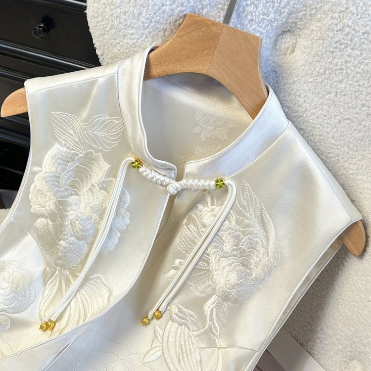 This elegant sleeveless Chinese-style vest, adorned with delicate flower embroidery, embodies the perfect balance of tradition and modernity. Its exquisite neckline and timeless design exude sophistication and charm. A poetic addition to any wardrobe, it awaits those who appreciate its beauty and grace.